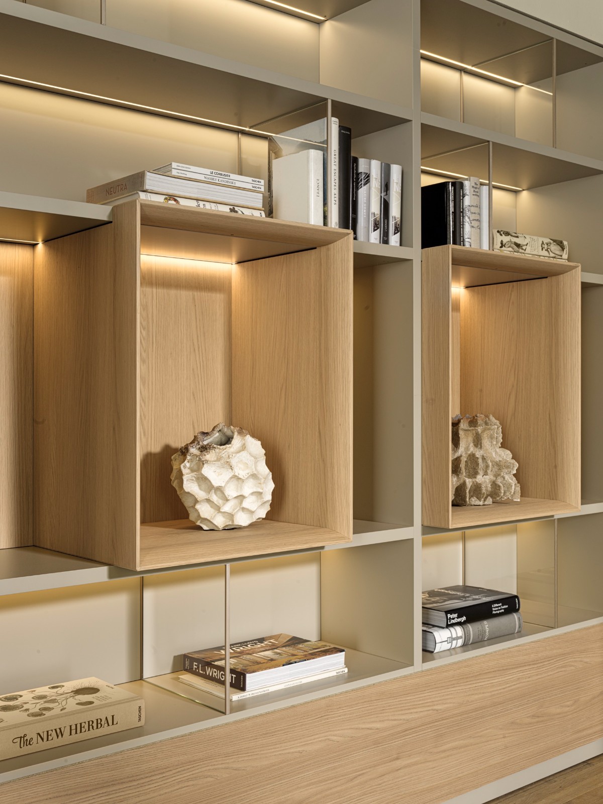 Gliss Master 在三聚氰胺抽屉正面引入了用于洞穴把手的新配件,具有锡色和青铜饰面,并可选择覆盖五种颜色的生态皮肤,从而扩大了其设计潜力;可选择插入一个辅助的内部隔栅、一个带有内部 LED 的倾斜玻璃鞋架架,最后,在本色洗衣篮中插入一个天然棉拉出物。